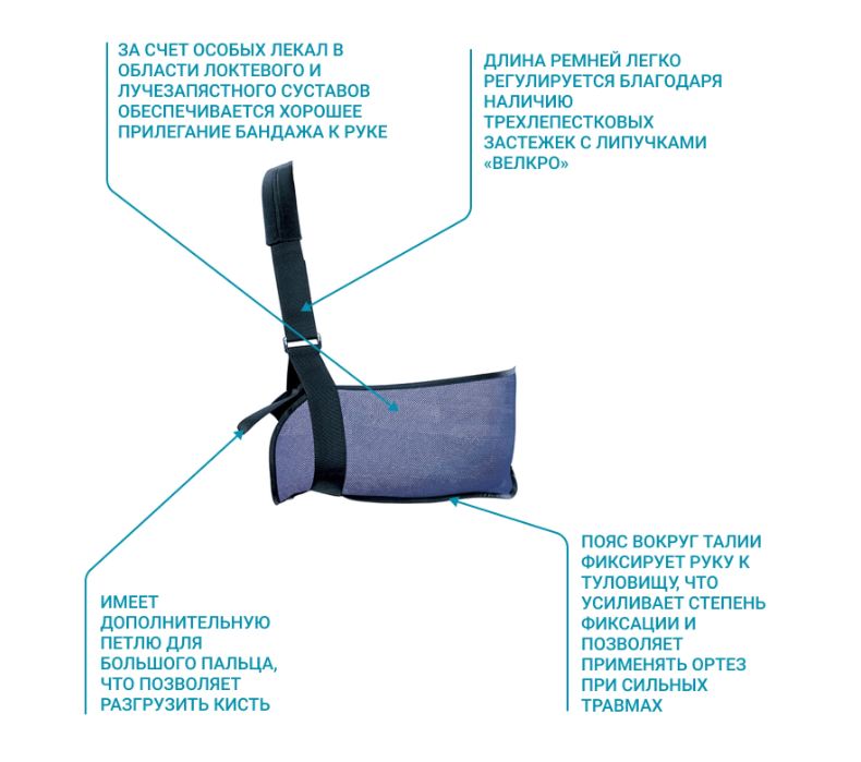 • дополнительный пояс вокруг талии позволяет фиксировать руку к туловищу, что  усиливает  степень фиксации и даёт возможность применять ортез при сильных травмах.